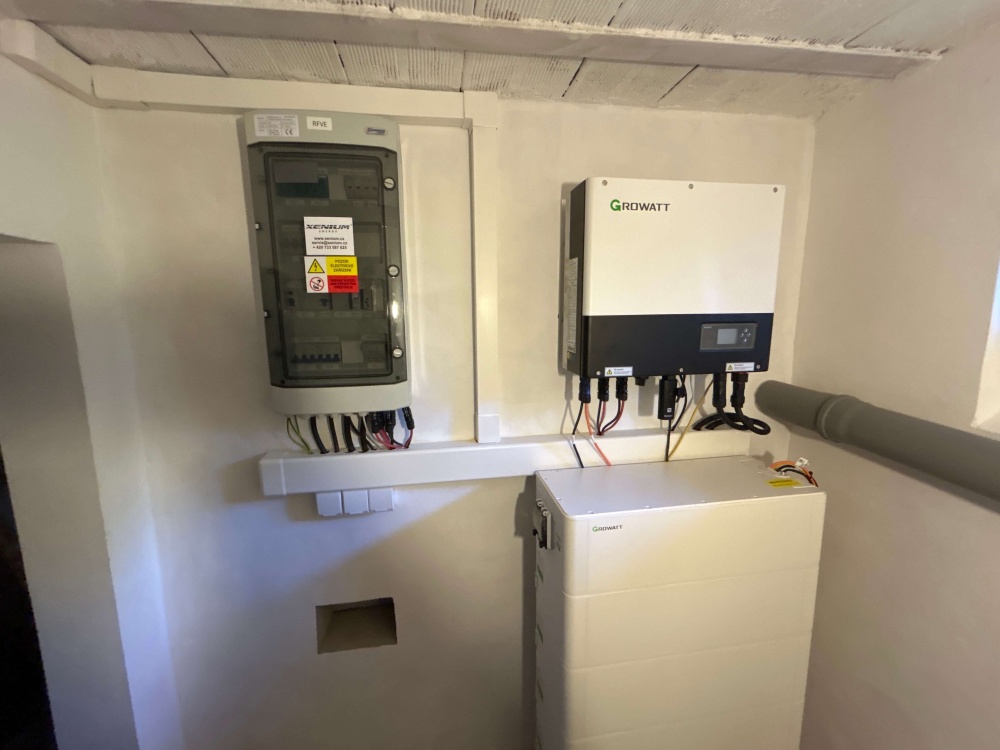 • FVE 9,26 kWp, střídač SPH 10000 TL3, bateriové úložiště 12,8 kWp, konstrukce samozátěž Jih.