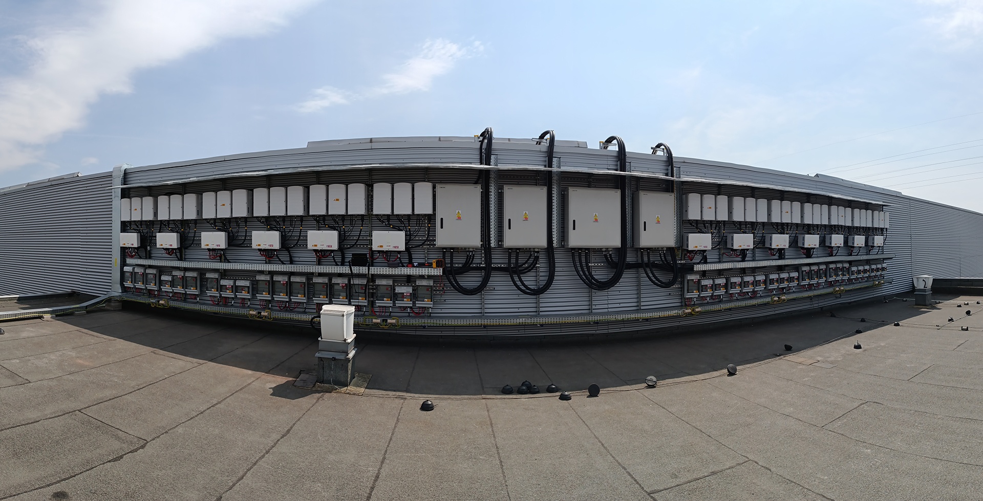 Na střeše jsme instalovali 1 750 panelů s optimizéry a 6 střídačů SolarEdge, doplněných o DC/AC rozvodnice a napojení do přípojného bodu. Zajistili jsme také přeložení hromosvodů a sladili rozmístění panelů s technologiemi klimatizací.