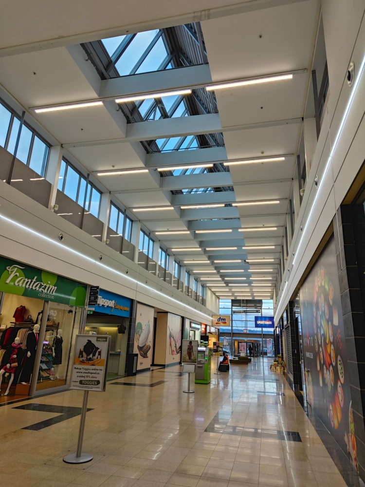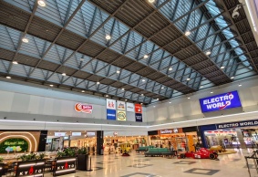 • Požadavkem investora byla jednoznačná úspora nákladů na osvětlení nákupního centra v pasážích a zázemí. Byl vytvořen projekt osvětlení včetně světelně technických výpočtů. Na základě toho proběhla kompletní výměna starého osětlení za nové moderní led úsporné osvětlení. Součástí toho bylo také nahrazení venkovního osvětlení a to pomocí úsporného led osvětlení BUBU.